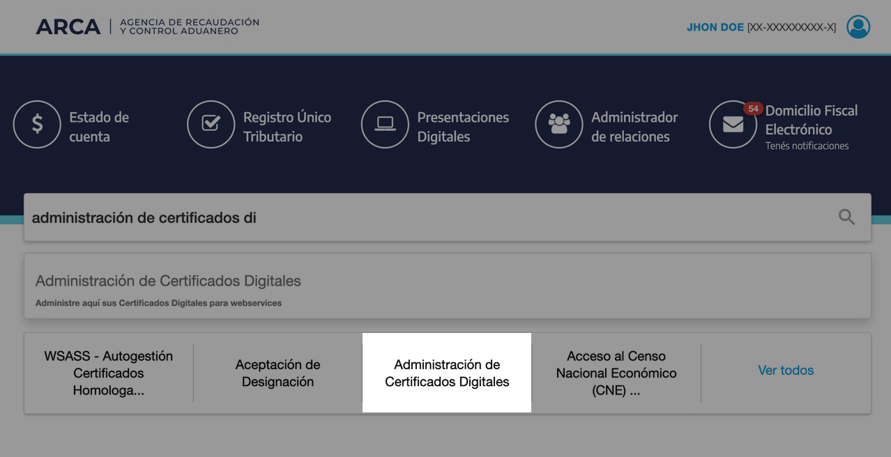 Dentro de nuestro escritorio de AFIP debemos ingresar en Administración de Certificados Digitales