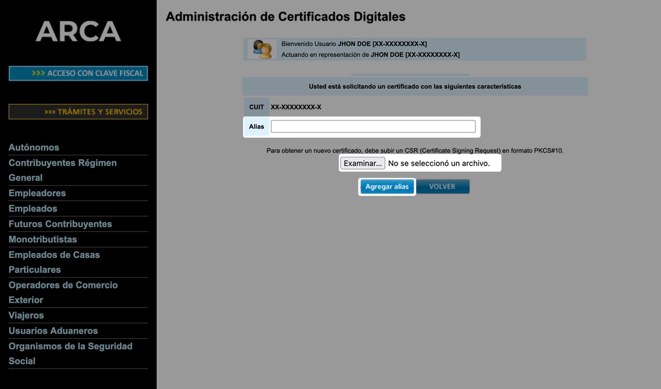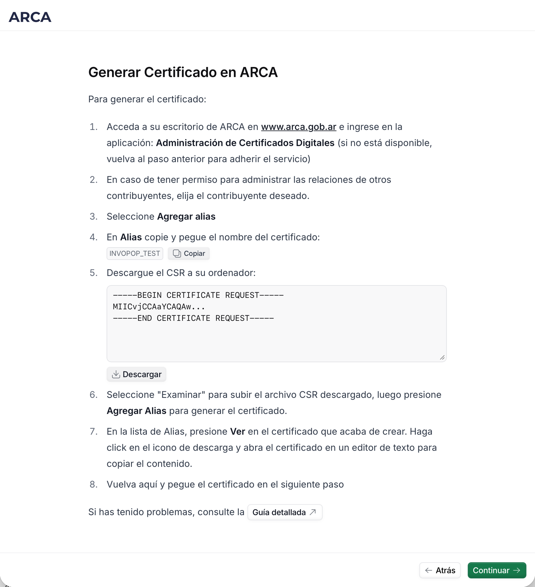 Un CSR es un bloque de texto codificado que le proporcionas a ARCA para solicitar un certificado SSL/TLS. Contiene información sobre tu organización y el dominio que deseas proteger.Copie el Alias y descargue el CSR a su ordernador.