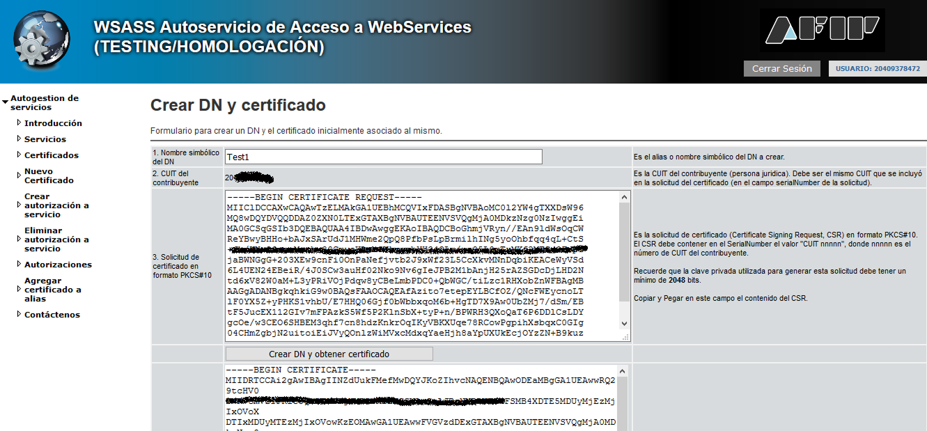 En 1. Nombre simbólico del DN a autorizar debemos seleccionar el certificado que queremos autorizar. En este caso usaremos el alias que hemos creado en el paso anterior.En 3. CUIT representado debemos ingresar el CUIT con el cual queremos utilizar el web service. En modo testing recomendamos usar el CUIT propio para no crear confusión.En 5. Servicio al que desea acceder debemos elegir wsfe (Web Service de Factura Electrónica).
